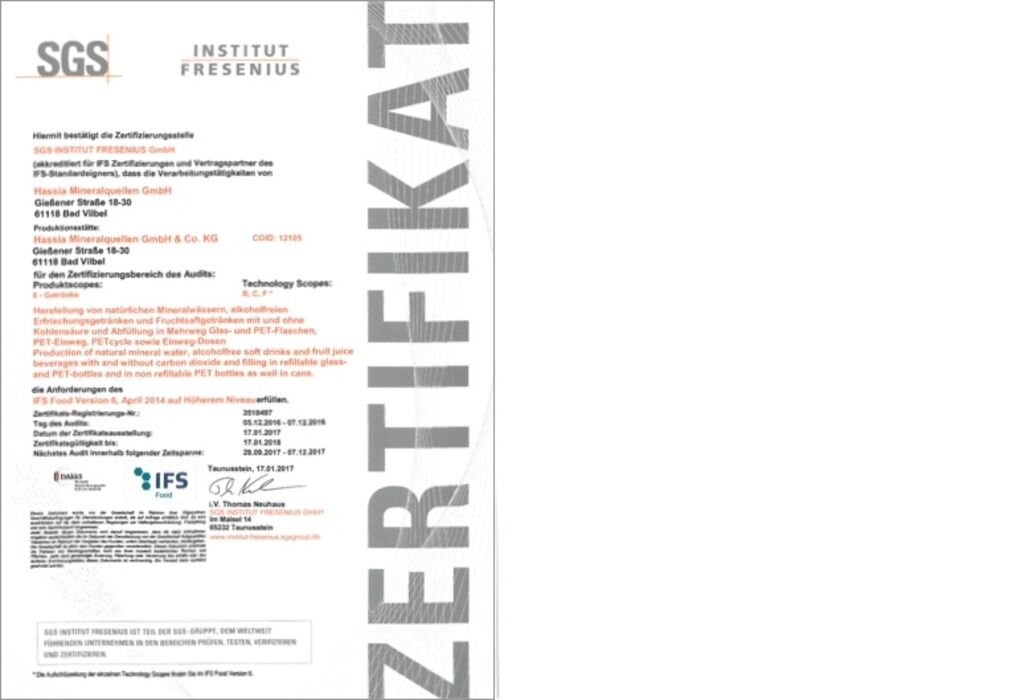 Wenn es um Lebensmittelsicherheit geht, ist der IFS Food einer der wichtigsten Standards mit einheitlichen Anforderungen für den Herstellungsprozess oder die Analytik von Produkten aus der Lebensmittelbranche. Alle Standorte der HassiaGruppe erfüllen diesen Standard. Um dieses Zertifikat zu erhalten, wird der gesamte Herstellungsprozess der Produkte sowie die Analytik aber auch die Gewährleistung des Schutzes der Lebensmittelkette (Food Defence) jährlich überprüft. Bereits seit 2007 besitzt Hassia Mineralquellen in Bad Vilbel ein Qualitätsmanagement, welches nach diesem Standard zertifiziert ist.