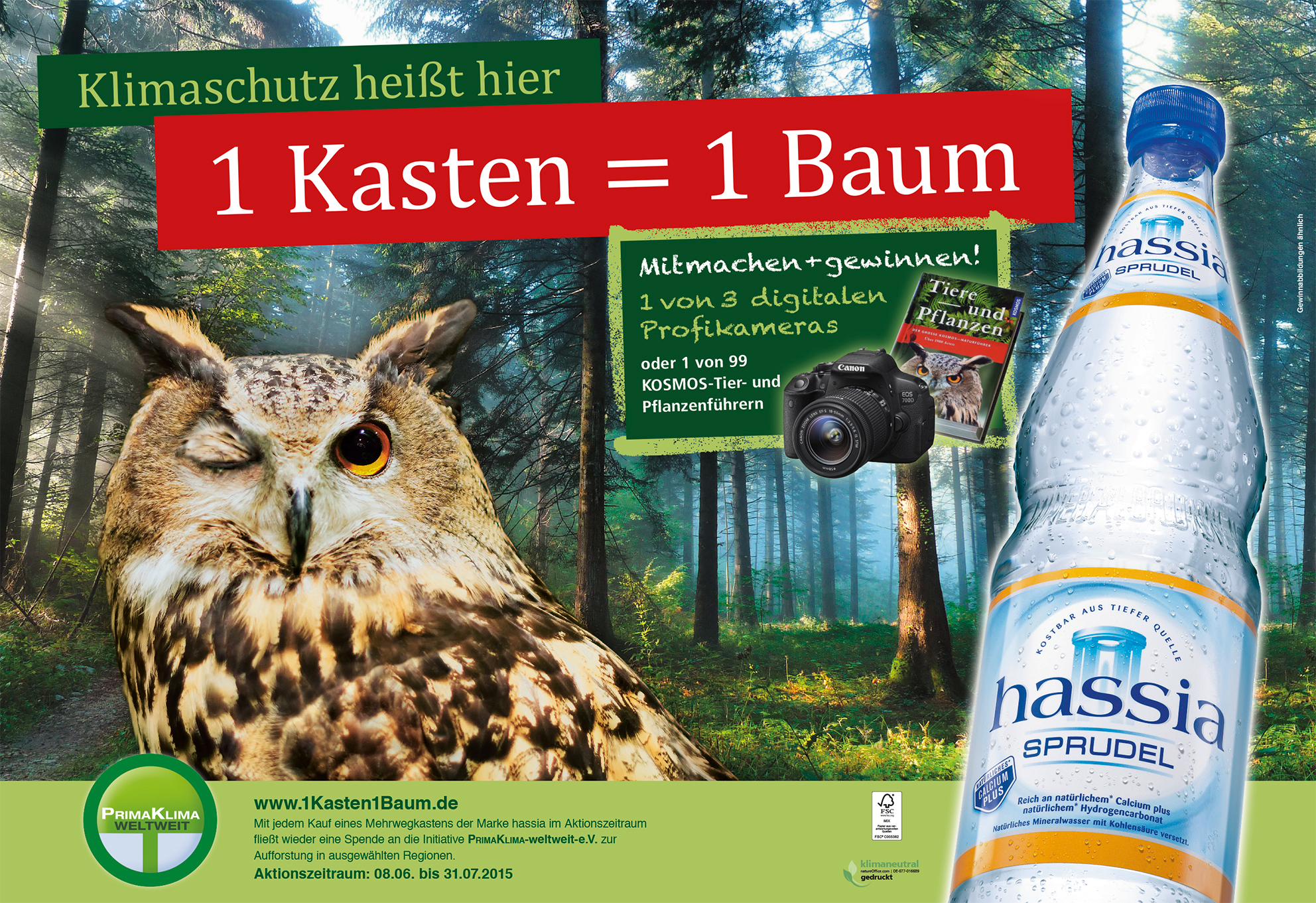 Bis zum 31. Juli 2015 ist mit jedem Mehrweg-Aktionskasten Mineralwasser und Erfrischungsgetränke der Marke hassia wieder automatisch eine Spende an die Initiative PrimaKlima -weltweit- e. V. verbunden. Der gemeinnützige Verein engagiert sich für Aufforstungen und den Schutz der Wälder.