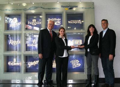 Hassia-Geschäftsführer Ullrich Schweitzer, bizzl-Markenmanagerin Vanessa Rosano (v.l.n.r.) und Hassia-Werbeleiter Michael Bergmann (rechts) freuen sich über die awk-Auszeichnung durch Elke Hergenröther (2 v.r).