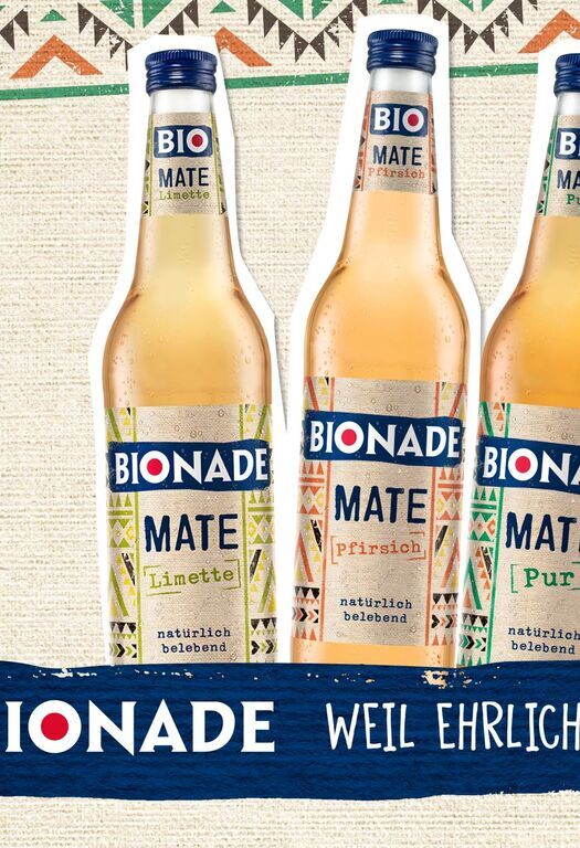 Der erfolgreiche Startschuss in zunächst sechs deutschen Städten zeigt: BIONADE Mate hat Potenzial. Jetzt geht der Bio-Pionier damit in die nationale Distribution. Schon ab April wird aus dem Duo ein Trio: Zu BIONADE Mate Pur und BIONADE Mate Pfirsich gesellt sich mit BIONADE Mate Limette eine weitere Sorte, ebenfalls in der Halbliter-Glasflasche mit praktischem Schraubverschluss.