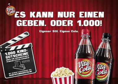 Schmalkalden/Lichtenau, März 2015. Mit ihrer Consumer Promotion 2015 veranstaltet VITA COLA großes Kino für Fans plus Freunde: Im zehnwöchigen Aktionszeitraum vom 6. April bis zum 14. Juni werden sechs Millionen 1,0 l PET-Mehrwegflaschen VITA COLA Original und VITA COLA Pur mit Teilnahmecodes im Handel sein. Jeder unter www.seidtatendurstig.de registrierte Code ist automatisch bei der Verlosung von wöchentlich 25 Sets á vier Kinokarten dabei. Jeder Gewinner kann also einen tollen Leinwandabend mit gleich drei Freunden teilen. Insgesamt werden 1.000 Kinogutscheine vergeben. Zusätzlich eröffnet sich mit jedem Code die Chance, ein Kinoquiz zu lösen. Dem Sieger nach Punkten auf dem Cineasten-Highscore winkt schlussendlich eine Heimkinoanlage von SONOS.