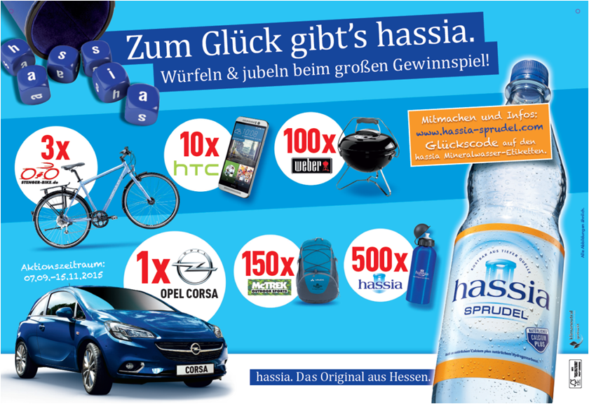 Bei dem Online-Gewinnspiel müssen Teilnehmer nur den achtstelligen Glückscode von den Flaschenetiketten der hassia Mineralwasser-Produkte unter www.hassia-glueckswuerfeln.de eingeben. Mit etwas Glück und zwei Würfen, um das Wort „hassia“ zu erlangen, geht es dann an das Glücksrad, an dem um die zahlreichen Sofortgewinne gespielt wird. Jeden Tag verlost hassia tolle Sofortgewinne: insgesamt drei Herkules Trekkingbikes, zehn HTC Smartphones, 100 Weber Grills, 150 Vaude Rucksäcke von McTrek sowie 500 hassia Alu-Trinkflaschen und 3.000 hassia Würfelspiele. Alle Teilnehmer, die beim online würfeln kein Glück hatten, nehmen automatisch an der Verlosung um einen Opel Corsa teil. Mit etwas Glück und zwei Würfen, um das Wort „hassia“ zu erlangen, geht es dann an das Glücksrad, an dem um die zahlreichen Sofortgewinne gespielt wird. Jeden Tag verlost hassia tolle Sofortgewinne: insgesamt drei Herkules Trekkingbikes, zehn HTC Smartphones, 100 Weber Grills, 150 Vaude Rucksäcke von McTrek sowie 500 hassia Alu-Trinkflaschen und 3.000 hassia Würfelspiele. Alle Teilnehmer, die beim online würfeln kein Glück hatten, nehmen automatisch an der Verlosung um einen Opel Corsa teil.