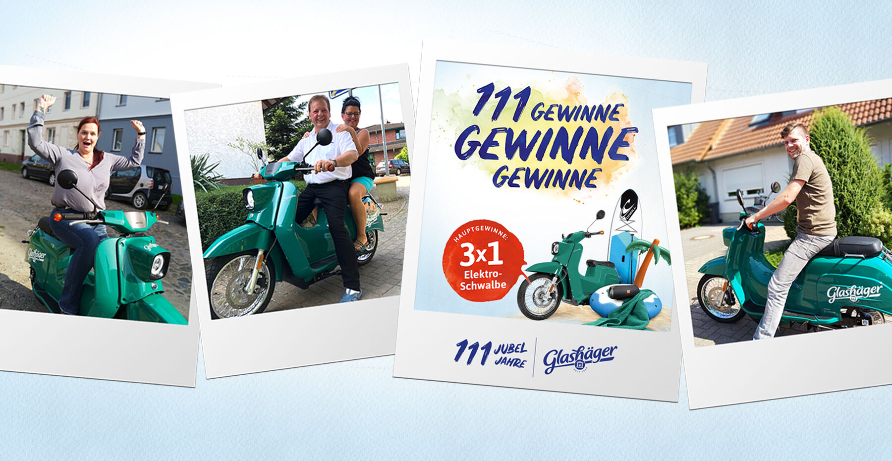Wer in diesem Sommer einen Kasten mit Glashäger Erfrischungen kaufte, konnte an der großen Jubiläums-Verlosung des Glashäger Brunnens teilnehmen und sich so die Chance auf einen von insgesamt 111 Sommer-Sonne-Strand-Preisen sichern. Dazu gehörten neben SUP Boards und Badeinseln auch Bluetooth-Boxen und Glashäger Badehandtücher. Die Highlights der Aktion aber waren die Hauptgewinne. Gleich drei Mal wurde der Kultroller „Schwalbe“ als moderne Elektro-Variante verlost.