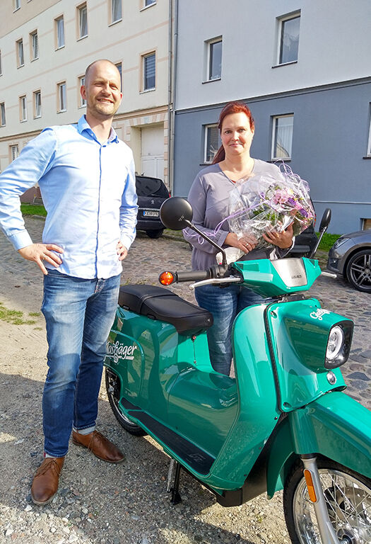 Als Überraschung erhielten alle drei Gewinner noch einen Original Schwalbe-Pilothelm und einen großen Blumenstrauß dazu. Wir wünschen allzeit gute und sichere Fahrt und viel Spaß mit der Elektro-Schwalbe von Glashäger.