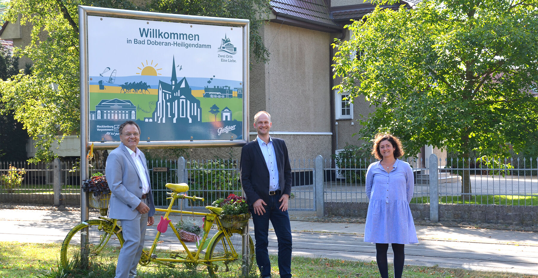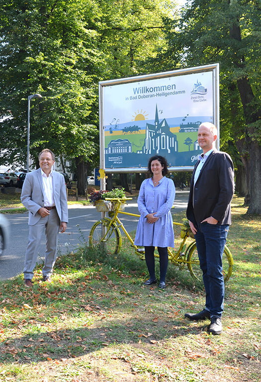 Jeder Besucher, der mit Auto oder Fahrrad auf einer der fünf großen Zufahrtsstraßen anreist, kann sich seit heute mit nur einem Blick ein Bild davon machen, was ihn in der Stadt erwartet. Bürgermeister Jochen Arenz, die Leiterin der Touristinformation Danielle Zimmermann und Axel Schümann, Leiter des Marketings beim Glashäger Brunnen enthüllten in der Doberaner Dammchaussee eine von fünf neuen großformatigen Tafeln, welche die Gäste ab sofort willkommen heißen werden. Die Schilder zeigen in moderner Form die wichtigsten Sehenswürdigkeiten und die zahlreichen Erlebniswelten Bad Doberans und Heiligendamms. Der Quelltempel und das Glashäger-Logo zeugen dabei von der Geschichte der Mineralwassernutzung und -förderung in der Region.