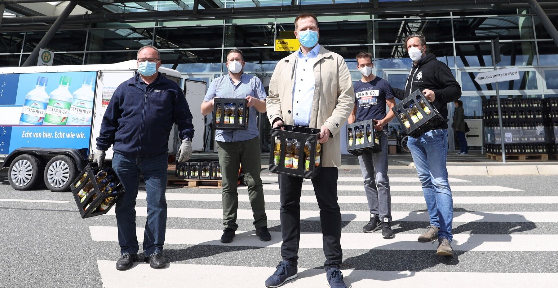 Das Mecklenburger Traditionsunternehmen Güstrower Schlossquell unterstützt das engagierte Corona-Impfteam des Landkreises Rostock: Güstrower-Mitarbeiter lieferten jetzt 5.000 Liter Apfelschorle im „Impfhafen“ am Flughafen Rostock-Laage an. Rund 40 Helfer sorgen hier vor Ort sowie mit zusätzlichen mobilen Impfteams dafür, dass aktuell täglich tausende Menschen der Region gegen das Corona-Virus geimpft werden. Das Team des Impfhafens umfasst dabei Menschen verschiedenster Berufe und Tätigkeiten von Ärzten, über Mitarbeiter des Flughafens Rostock und der lokalen Tourismusbranche bis hin zu Ehrenamtlichen.