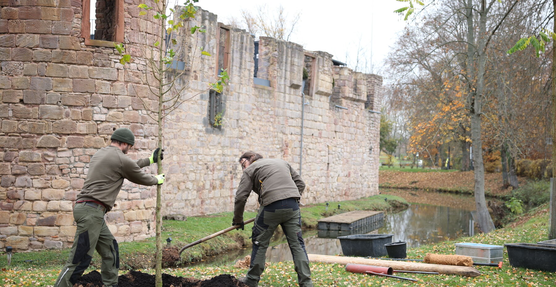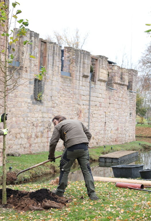 Bad Vilbel, 20. November 2020. Seit heute steht ein stattlicher neuer Baum im beliebten Bad Vilbeler Burgpark. Mit vier Metern Höhe setzt die Baumhasel ein sichtbares Ausrufezeichen: Der Baum markiert zugleich den Abschluss der erfolgreichen Aktion „Baumstark für Hessen: Zehn Bäume für zehn Städte“ der Mineralwassermarke hassia.