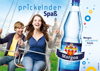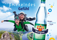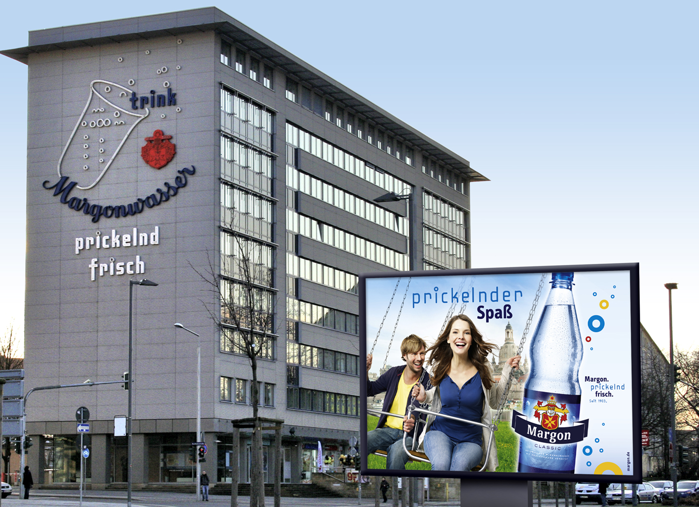 Nun lebt die Kulturgeschichte in frischer Form als Werbekampagne wieder auf. „Im Laufe der Jahre ist Margon wie kein anderes Mineralwasser zu einem Teil der sächsischen Geschichte geworden und mit Kultur, Landschaft und den Menschen im Freistaat eng verbunden“, erklärt Paul K. Korn, Geschäftsführer des Brunnens und ergänzt: „So ist auch der bis in die 90er Jahre verwendete Claim ‘Margon. prickelnd frisch.’ vielen Sachsen noch heute ein Begriff.“ Doch Margon greift in der neuen Kampagne nicht nur den Slogan aus der Leuchtreklame wieder auf. Auch die verwendete Schrift aus den 50er Jahren und das stilisierte Prickeln, welches bereits in den 30er Jahren die Marke prägte, werden neu interpretiert und mit prickelnden, regionalen Motiven untersetzt. So bilden der Fallschirmsprung in der Sächsischen Schweiz oder die Motive an den Dresdner Elbwiesen und im Konzertsaal einen spannenden Kontrast zu den historischen Wurzeln der Marke.