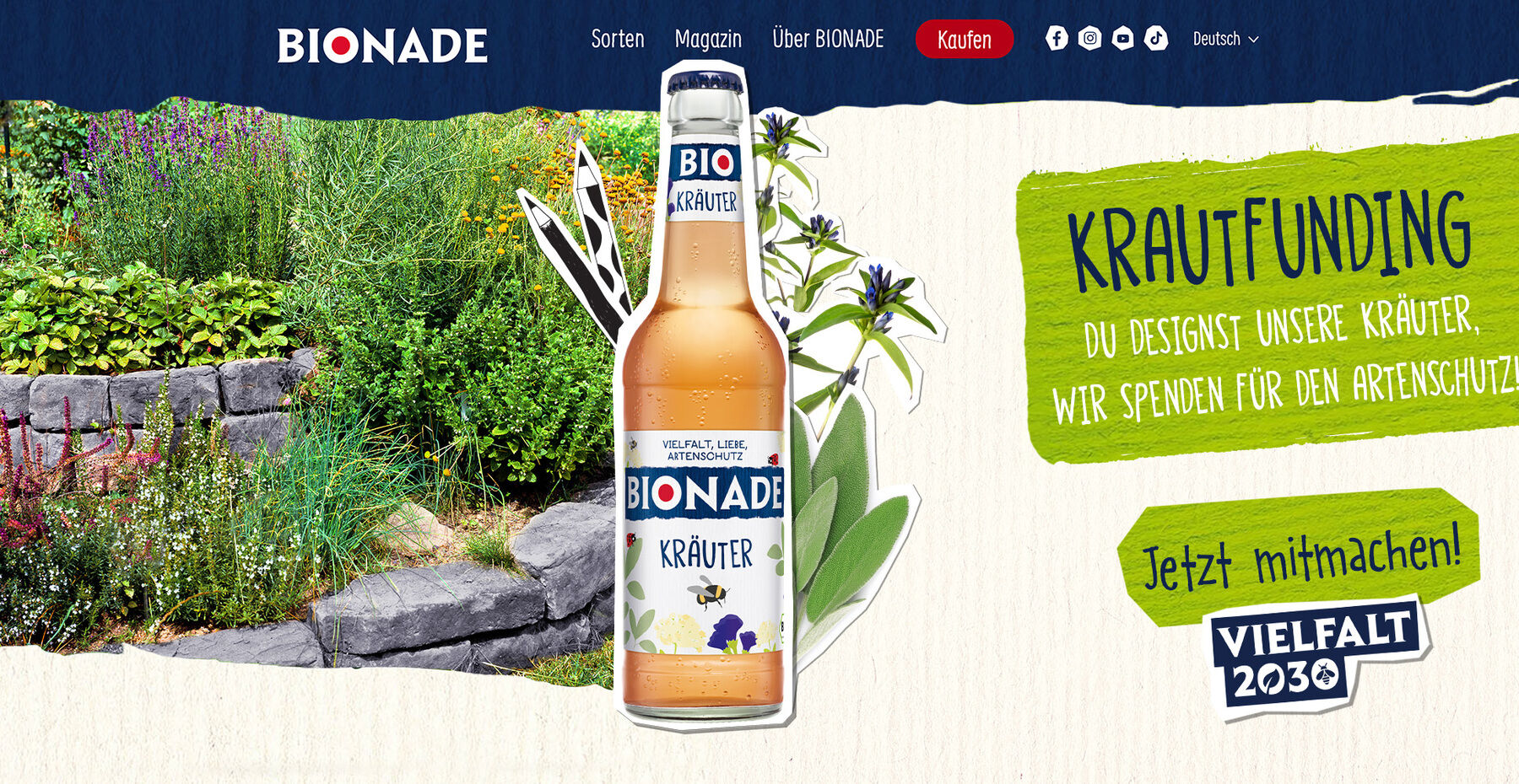 Unter dem Motto „Krautfunding – du designst unsere Kräuter. Wir spenden für den Artenschutz“ sind kreative Nachwuchsdesigner jetzt bis zum 31. Januar 2023 aufgerufen, ein einzigartiges Etikettendesign für BIONADE Kräuter einzureichen. Die Aufgabe: Bunt und vielfältig soll es sein, damit es direkt ins Auge fällt. „Und schon auf den ersten Blick zeigt, was uns bei BIONADE wichtig ist – der Schutz und Erhalt der Artenvielfalt“, so Marketingleiterin Corinna Fuchs. „Deshalb werden wir auch von jeder verkauften Flasche der BIONADE Kräuter Edition 5 Cent für die Biodiversity Foundation von Dirk und Ingrid Steffens spenden, mit denen wir die Initiative ‚Vielfalt 2030‘ ins Leben gerufen hatten.“