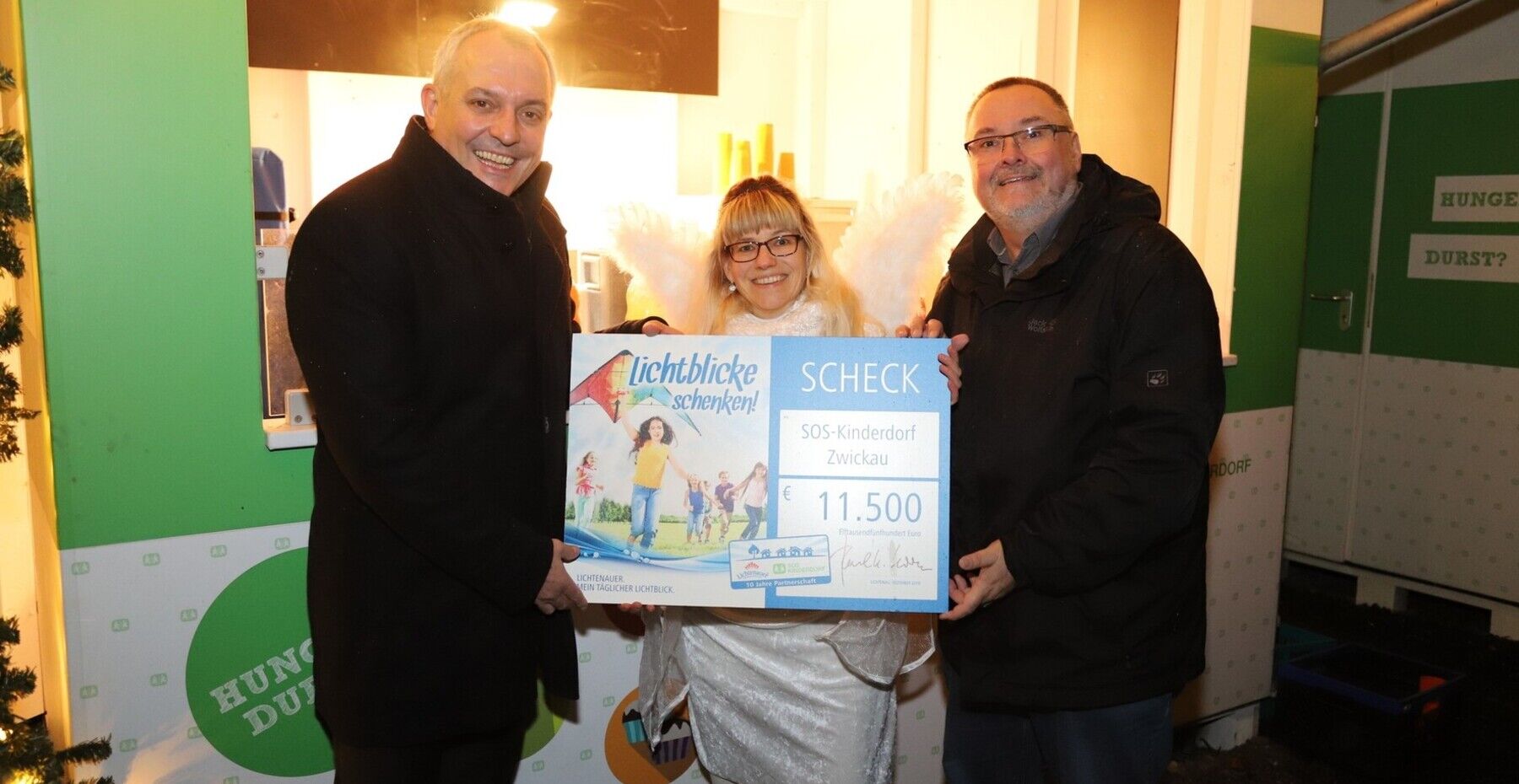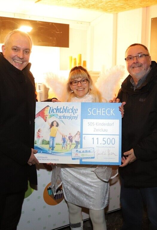 Paul Korn, Geschäftsführer der Lichtenauer Mineralquellen, überreicht den Scheck in Höhe von 11.500 Euro an Jana Seidel und Heico Engelhardt vom SOS-Kinderdorf Zwickau (v.l.n.r.).