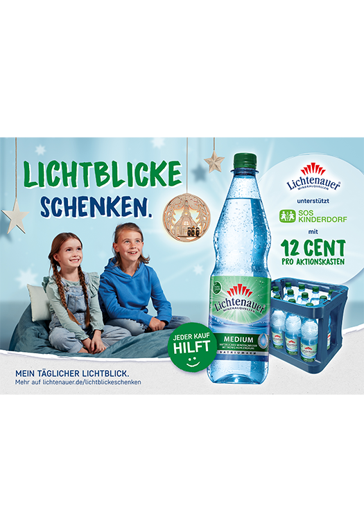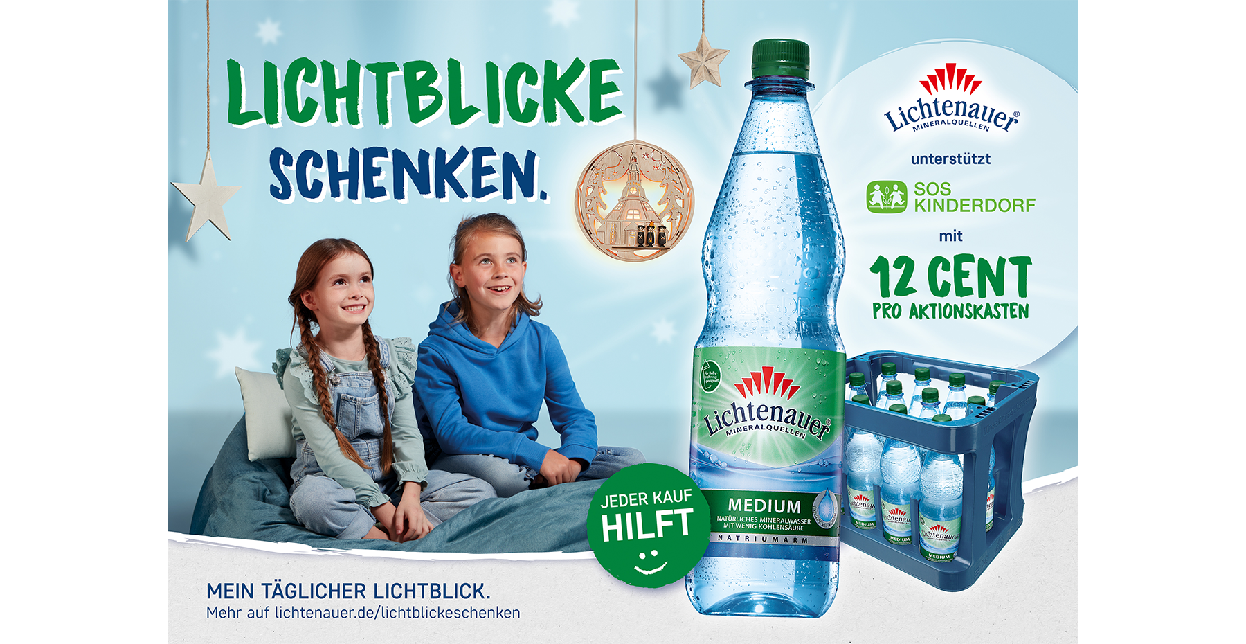 Die finanzielle Zuwendung ergibt sich aus dem Verkauf von Aktionskästen mit Lichtenauer Mineralwasser, die Lichtenauer Kunden von Oktober bis Dezember im Handel finden. Für jeden Kasten fließen 12 Cent in die Aktion „Lichtblicke schenken“ und damit in das Kinderdorfzentrum Leipzig. Plakate, Station Videos und Radiospots bewerben die Aktion mit hoher Reichweite in der Vertriebsregion.