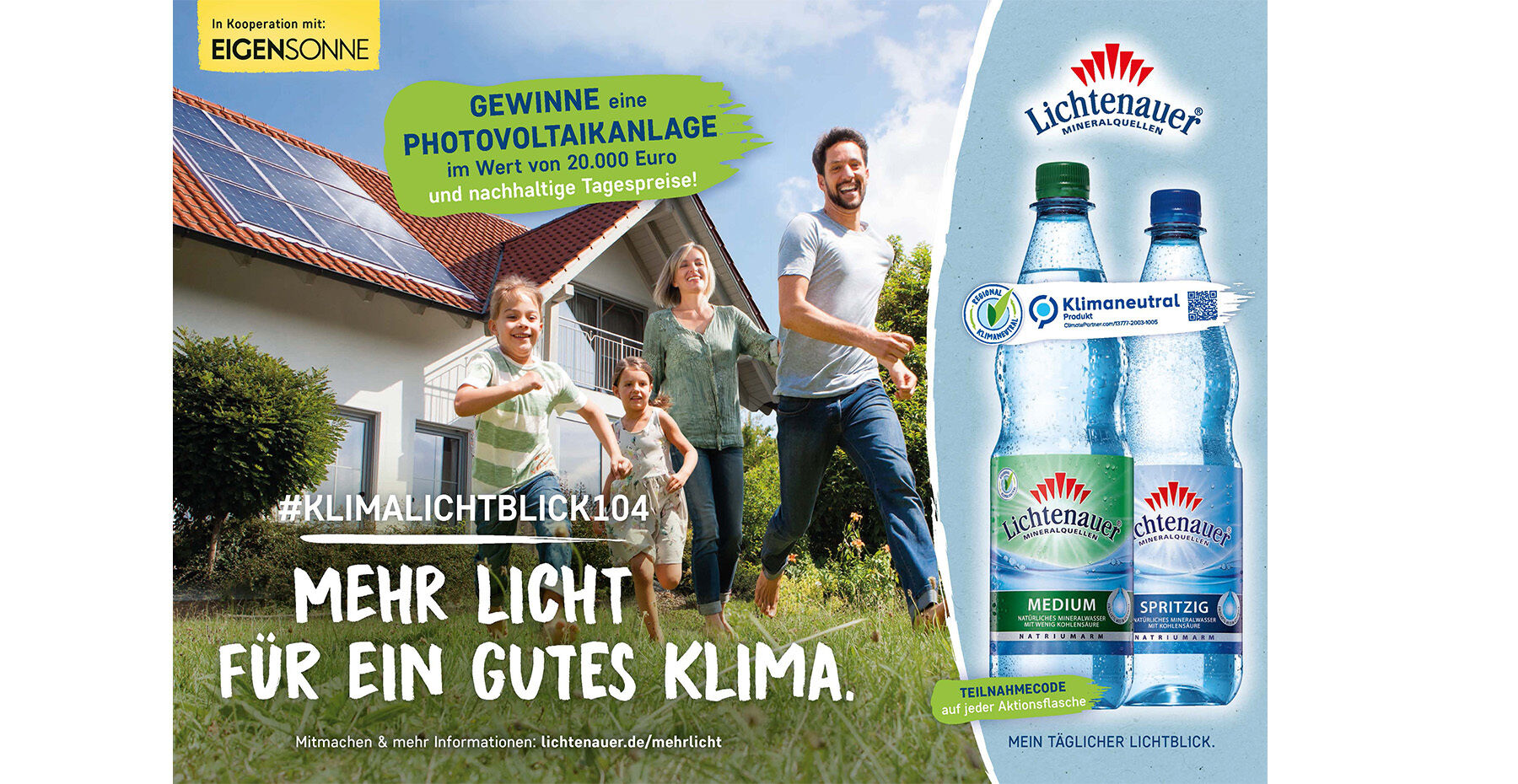 Lichtenauer Mineralwasser steht auch in diesem Jahr ganz im Zeichen der Klimaneutralität. In diesem Zusammenhang möchte das sächsische Brunnenunternehmen mit der diesjährigen Consumer Promotion die Konsumentinnen und Konsumenten für das Thema nachhaltige Erzeugung von regenerativem Strom sensibilisieren. Als Hauptpreis wird unter allen Teilnehmenden eine Photovoltaikanlage im Wert von 20.000 Euro verlost. Dafür konnte Lichtenauer mit EIGENSONNE aus Berlin einen starken regionalen Partner gewinnen. Attraktive wechselnde Tagesgewinne regen zusätzlich zur Teilnahme an.