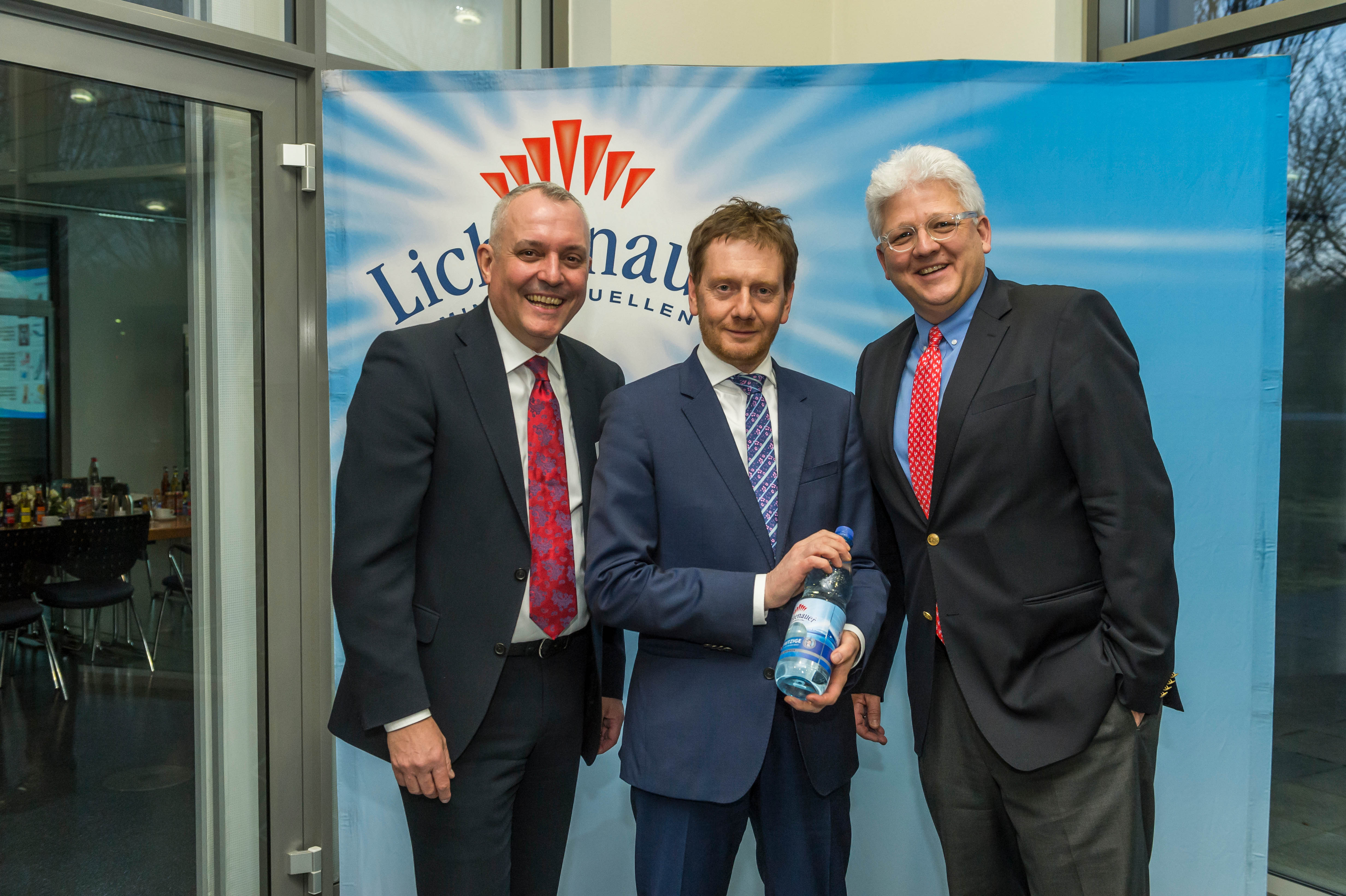 Im Anschluss durfte Ministerpräsident Kretschmer per Knopfdruck die viermilliardste Mineralwasserflasche abfüllen, die ihm anschließend mit einem eigens für ihn kreierten Sonderetikett von Geschäftsführer Paul K. Korn feierlich überreicht wurde. Korn: „Wir dürfen uns in Lichtenau über ein sehr erfolgreiches Jahr 2017 freuen, in dem wir viele Unternehmensziele erreichen und umsetzen konnten. Wir schätzen uns glücklich, diesen Erfolg mit dem neuen Ministerpräsidenten heute feiern zu können. Unsere viermilliardste Flasche trägt auf ihrem Sonderetikett den Leitspruch ‚Spritzige Politik mit neuem Geist‘. Damit wünschen wir Herrn Kretschmer alles Gute in seiner gerade begonnenen Amtszeit als Ministerpräsident in Sachsen.“