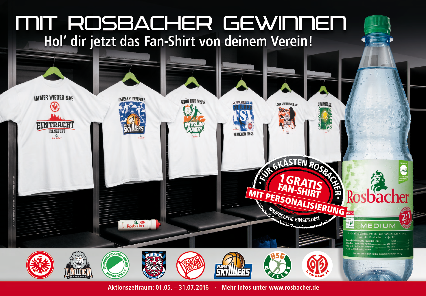 Bad Vilbel, den 29.04.2016 – Im Mai startet die neue Promotion von Rosbacher, mit der jeder Verbraucher zum Gewinner wird. Die Mechanik ist ganz einfach: Rosbacher kaufen, Kassenbelege einsenden und automatisch gewinnen – dieses Mal ein Fan-Shirt vom Lieblingsverein aus dem regionalen Spitzensport. Und das sind die Partner der neuen Rosbacher-Gewinnaktion: Eintracht Frankfurt, FSV Frankfurt, 1. FSV Mainz 05, Kickers Offenbach, Löwen Frankfurt, Fraport Skyliners, HSG Wetzlar und Tennisklub Grün-Weiß Mannheim.