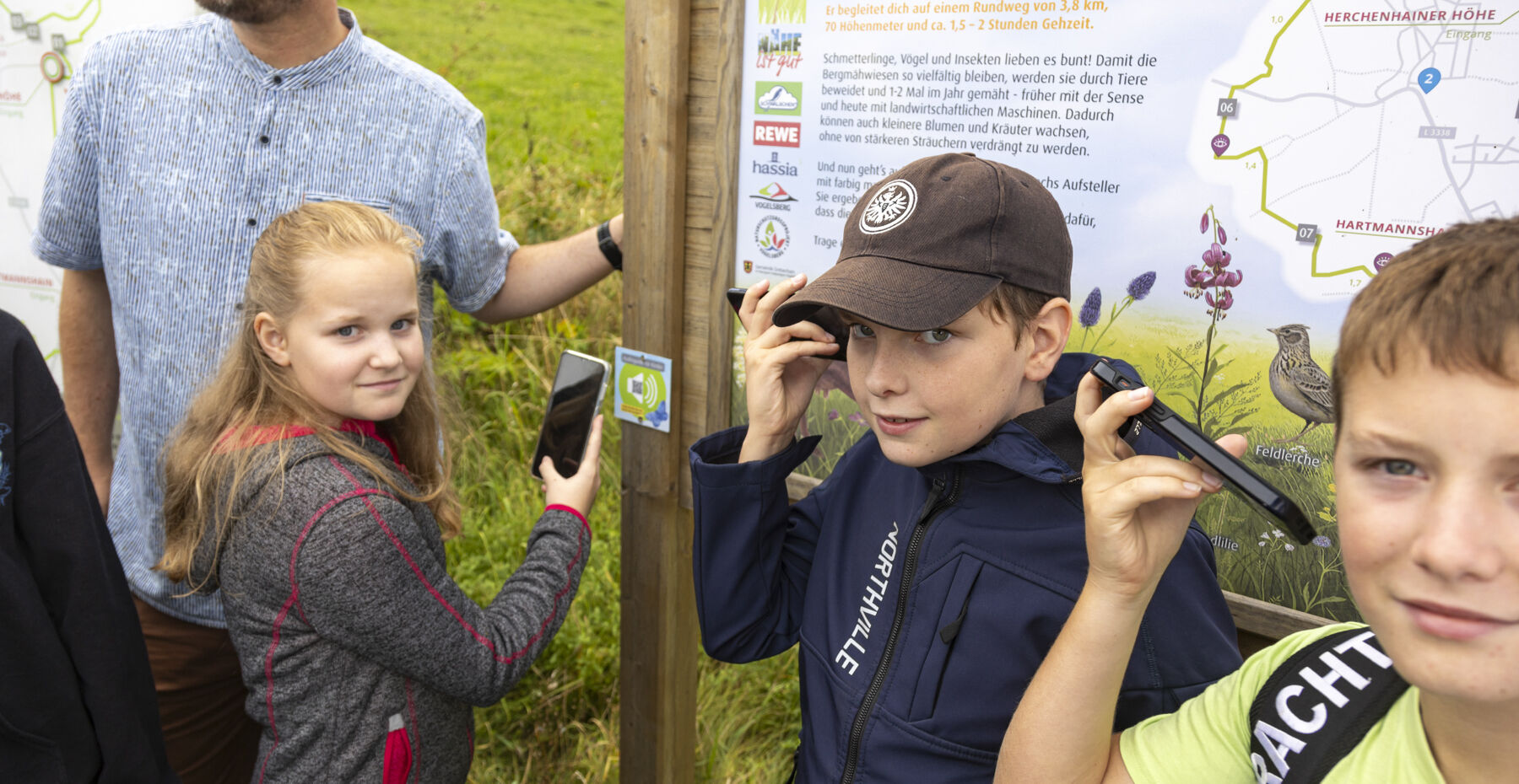 Die Kinder können den Familien-Pfad ab jetzt mit dem neuen Audioguide erleben, der die sechs Aufsteller von Haselmaus, Teufelskralle & Co auf dem 3,8 Kilometer langen Rundweg zum Leben erweckt. In einer fortlaufenden Geschichte, beginnend an der Eingangsstele an der Herchenhainer Höhe (Eingang Bergmähwiesen-Pfad), erzählen sie den Kindern von ihrem wundervollen Lebensraum Bergmähwiese und führen sie mit Spaß und Spiel über den Familien-Pfad. So lernen sie den Lebensraum Bergmähwiese aus der Sicht ihrer Bewohner:innen kennen und erfahren spielerisch, wie der Mensch dazu beiträgt, diese wertvollen Wiesen zu erhalten. „Mit diesem gemeinsamen Projekt möchten wir noch mehr Kinder erreichen und über das menschgemachte Naturwunder Bergmähwiese informieren,“ erläuterte Günther Berz-List, Geschäftsführer der Schwälbchen Molkerei, die Motivation von „Nähe ist gut“. „Der Audioguide vermittelt die komplexen Zusammenhänge auf eine leicht zugängliche kindgerechte Weise und ermöglicht es ihnen, die Bergmähwiesen mit lebhaften Beispielen zu erkunden.“ Warum der Lebensraum Bergmähwiese so wertvoll für Artenvielfalt in Hessen ist, betonte Patrick Krug, Erster Kreisbeigeordneter des Vogelsbergkreises: „Auf 25 Quadratmetern kommen hier bis zu 61 Pflanzenarten vor, darunter Arnika, Goldhafer und Weicher Pippau. Gleichzeitig befinden sich über die Hälfte aller hessischen Bergmähwiesen im Vogelsberg. Das macht diese Region zu einem Hotspot der Biodiversität“.