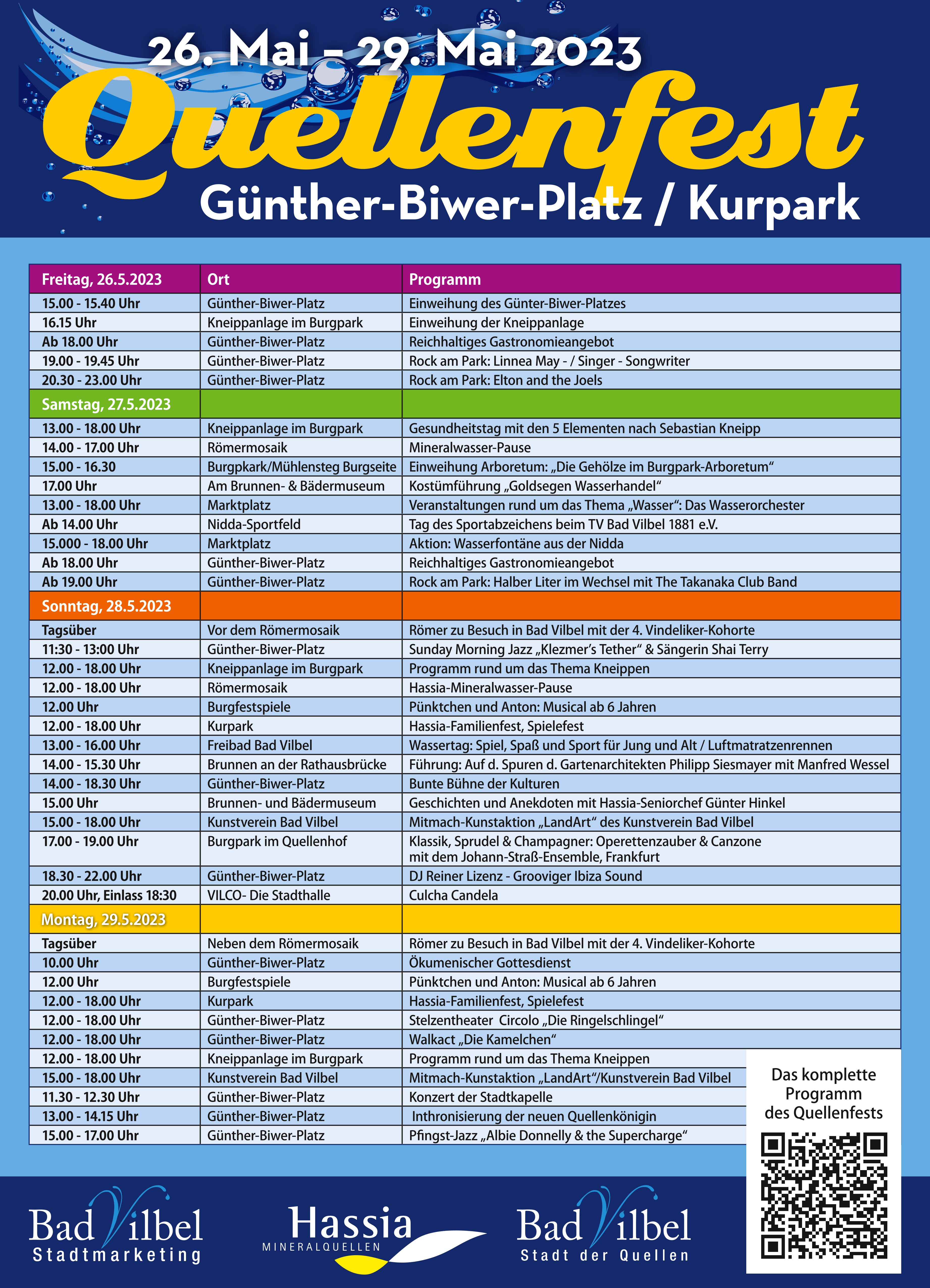 Kistenklettern, Kinderschminken und viele weitere Aktivitäten erwarten kleine und große Besucher zum Quellenfest im Kurpark. Von 12 bis 18 Uhr am Pfingst-Sonntag und -Montag kann nach Herzenslust gespielt, gehüpft, geklettert, gebastelt und gelacht werden. Am Montag findet das Quellenfest-Programm auch auf dem Günther Biwer-Platz statt: ein ökumenischer Gottesdienst aller Bad Vilbeler Kirchengemeinden, die Stadtkapelle sowie die Jazz-Bang „Albie Donnelly‘s Supercharge“ stehen auf der Bühne. Höhepunkt wird die Inthronisation der neuen Quellenkönigen sein. Daneben bieten Walking Acts sowie das Familienzentrum und der Kunstverein Bad Vilbel individuelle Aktionen an. Radio FFH-Moderator Frank Pieroth führt durch das Programm. Der Eintritt ist natürlich frei.