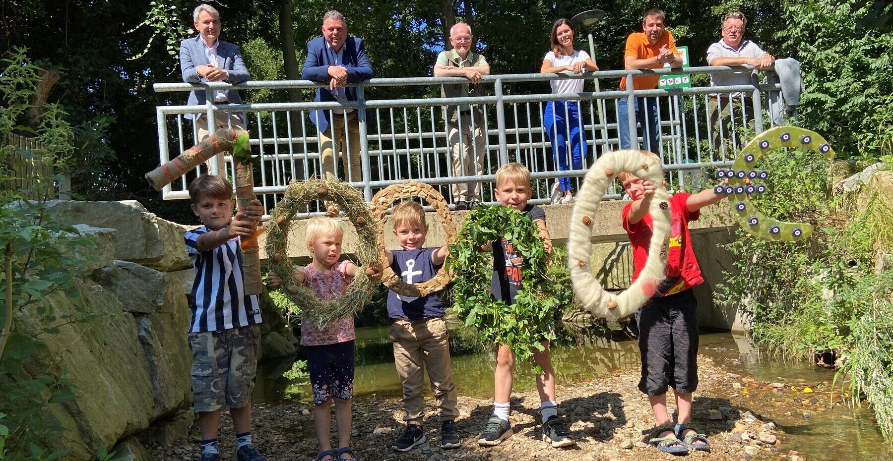 Hassia Mineralquellen unterstützt die Fließgewässer-Renaturierung der Rosbach mit 10.000 Euro. Anstelle eines Spendenschecks sorgten die Kinder der Kita „Luna“ aus Nieder-Rosbach kreativ für die symbolische Darstellung der Spendensumme. „Ein herzlicher Dank für die großzügige Spende gilt Hassia Mineralquellen“, sagte Maar. Hassias Nachhaltigkeitsbeauftragte Laura von Flemming und IT-Teamleiter Heiko Blecher sind stolz auf das Engagement ihres Arbeitgebers.