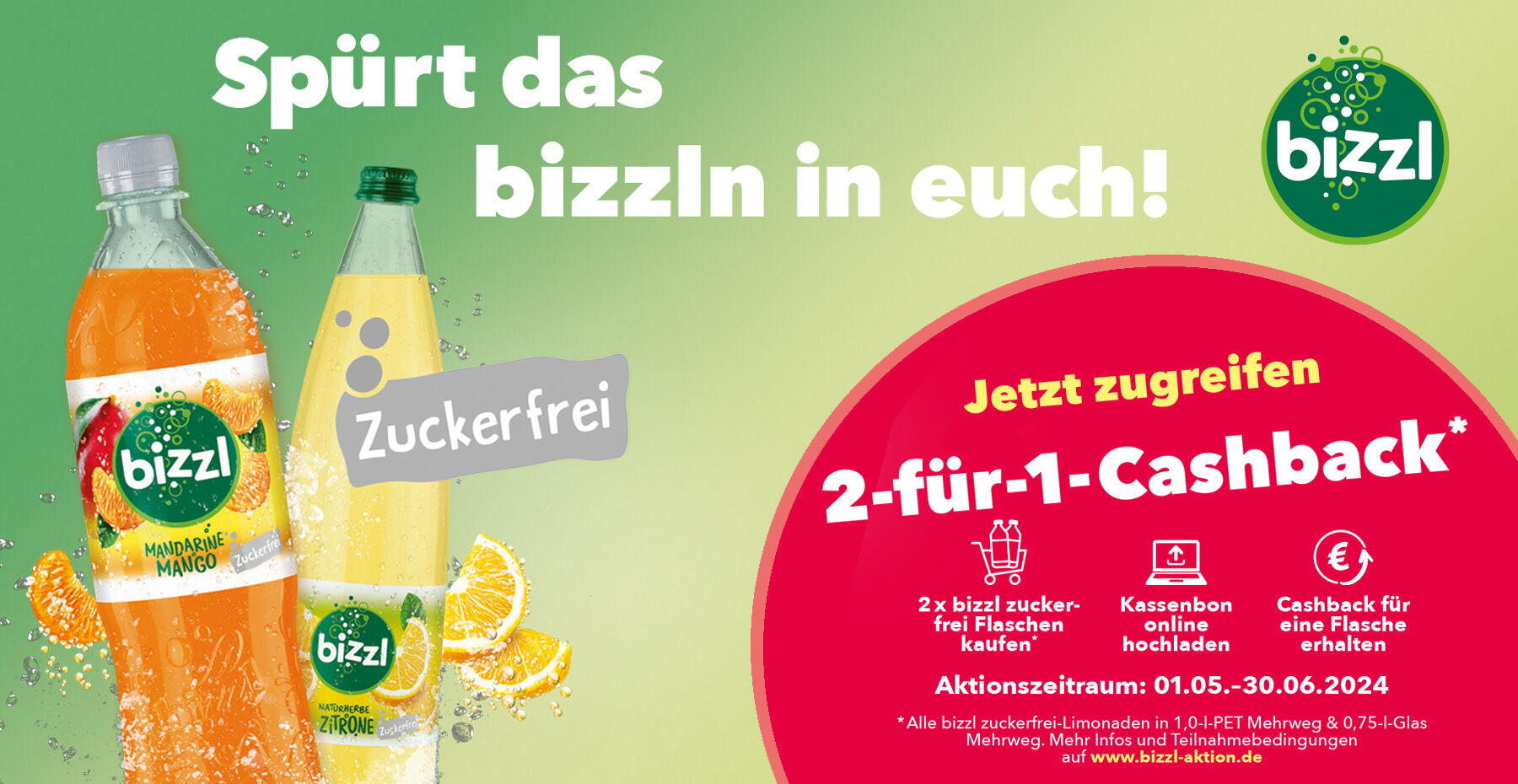 Wer von Anfang Mai bis Ende Juni zwei zuckerfreie bizzl Aktions-Getränke kauft und den Kassenbon unter www.bizzl-aktion.de hochlädt, bekommt den Kaufpreis eines Produktes erstattet. Mehrfachteilnahmen mit entsprechend mehreren Kassenbons sind möglich. Das 2:1 Cashback-Angebot gilt für alle 1,0 l PET-Mehrweg-Flaschen der Sorten bizzl zuckerfrei Naturherbe Zitrone, Mandarine Mango, Orange, Zitrusfrüchte, klare Zitrone, Pink Grapefruit und Cola Mix sowie die 0,75 l Glas-Mehrweg-Flaschen der Sorten bizzl zuckerfrei Naturherbe Zitrone und Orange.