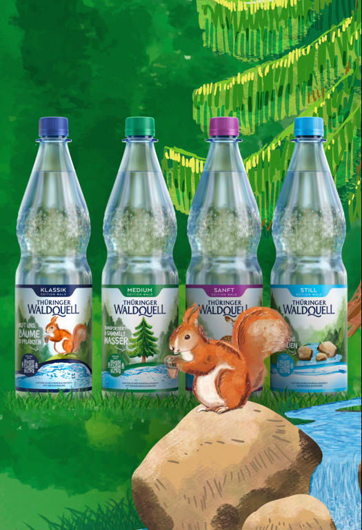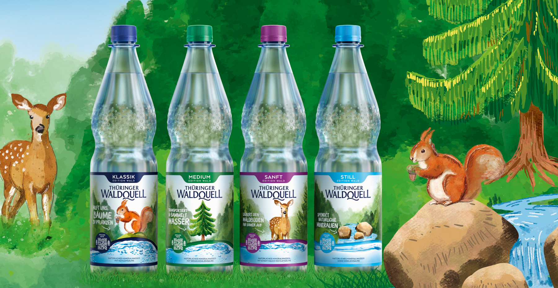 „Mineralwasser ist der Durstlöscher Nr. 1 von Thüringer Waldquell. Ein guter Grund, das beliebte Naturprodukt mit einer limitierten Design Edition auf emotionale Art und Weise ganz besonders in Szene zu setzen“, sagt Saskia Huneke, Marketingleiterin bei Thüringer Waldquell. „Auf den handgezeichneten Etiketten im Aquarellstil bilden wir den Wald als Ursprungsort unseres Mineralwassers ab.“ Jede der vier Mineralwassersorten zeigt auf einem individuell gestalteten Etikett jeweils einen Waldbewohner: Eichhörnchen, Reh, Bäume und Gesteine. Diese Waldbewohner sind bereits seit Längerem Teil der Thüringer Waldquell Markenkampagne. Darüber hinaus führen QR-Codes auf den Etiketten zu einer eigens für die Kampagne gestalteten Landingpage, die darüber informiert, wie die einzelnen Waldbewohner dazu beitragen, das Ökosystem Thüringer Wald und damit auch das Mineralwasser aus den Tiefen des Thüringer Waldes zu schützen und zu erhalten.