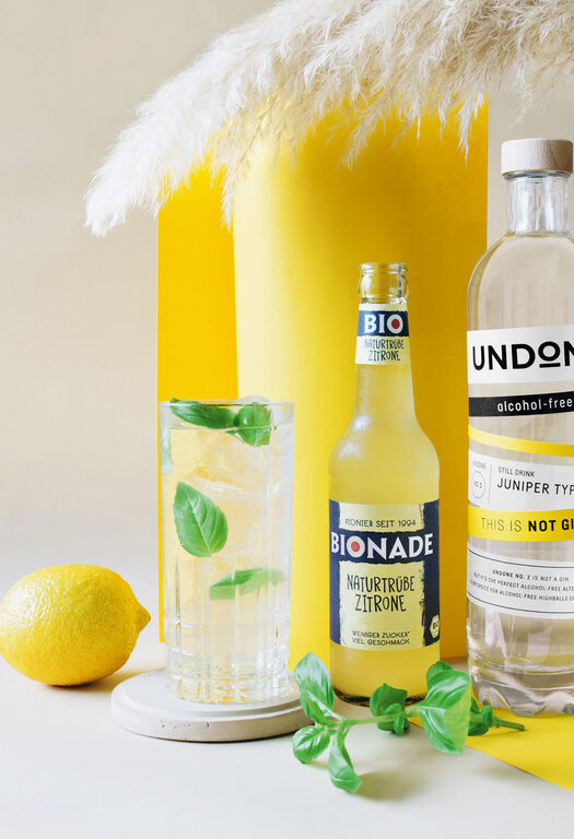 Die Kombination aus Gin und Basilikum ist mittlerweile in jeder guten Barkarte angekommen. Die alkoholfreie Gin-Alternative wird bei diesem Drink mit BIONADE Naturtrübe Zitrone kombiniert.