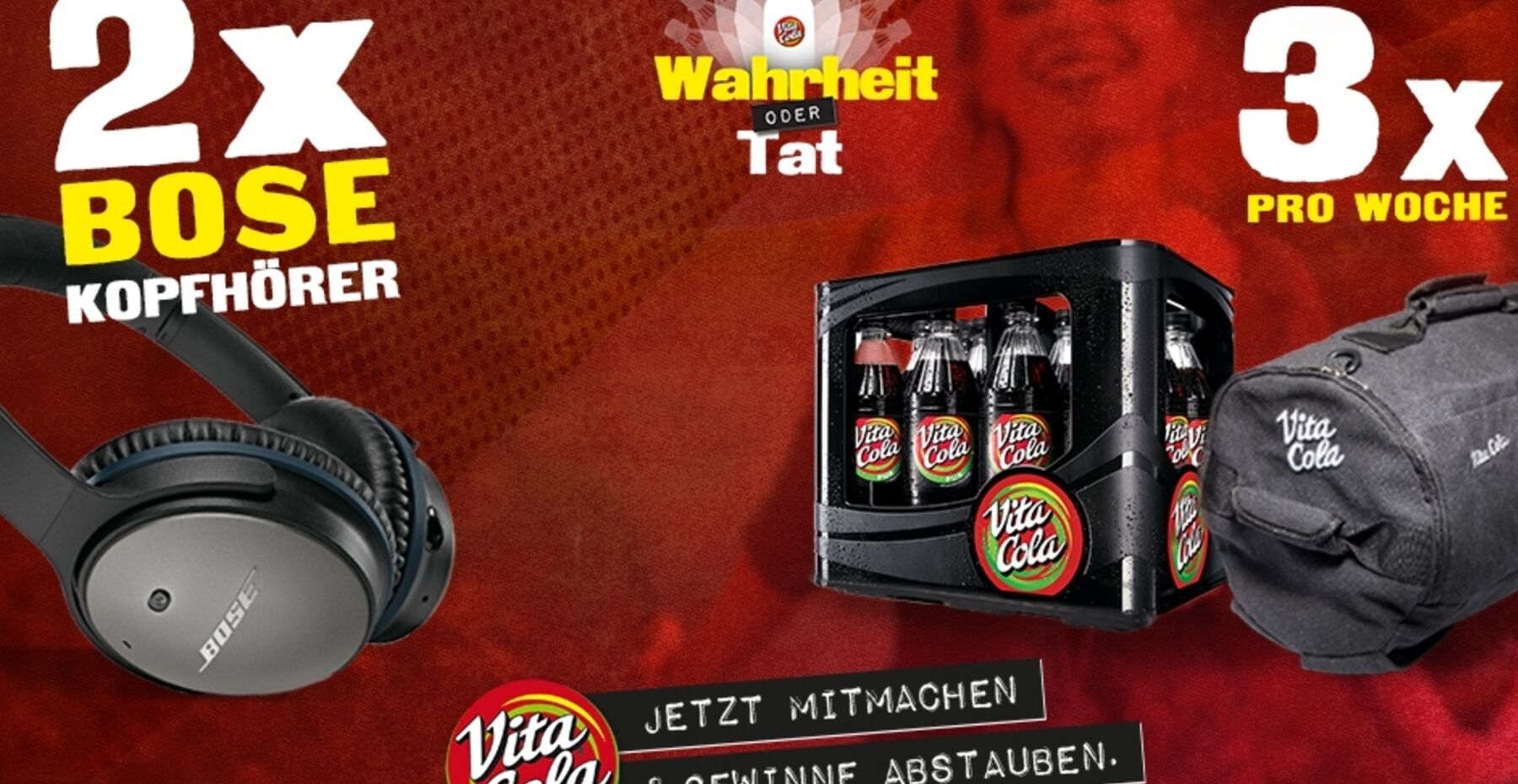 Schmalkalden/Lichtenau, 29. September 2016. „Wahrheit oder Tat“ heißt die große Frage in der neuen Challenge von VITA COLA, die ab dem 4. Oktober 2016 auf www.vita-cola.de startet. Endverbraucher können in dieser Onlineversion des Partyklassikers wählen, ob sie eine Frage kreativ beantworten oder kuriose Aufgaben lösen und davon ein Foto oder Video machen, das sie in die Galerie auf www.vita-cola.de einstellen. Sechs Wochen lang werden dafür unter allen Teilnehmern wöchentlich drei Kästen VITA COLA Pur plus je ein VITA COLA Duffle BackPack verlost. Am Ende gewinnen die beiden originellsten Beiträge hochwertige Bose-Kopfhörer. Die Aktion wird online auf Facebook und Instagram beworben.