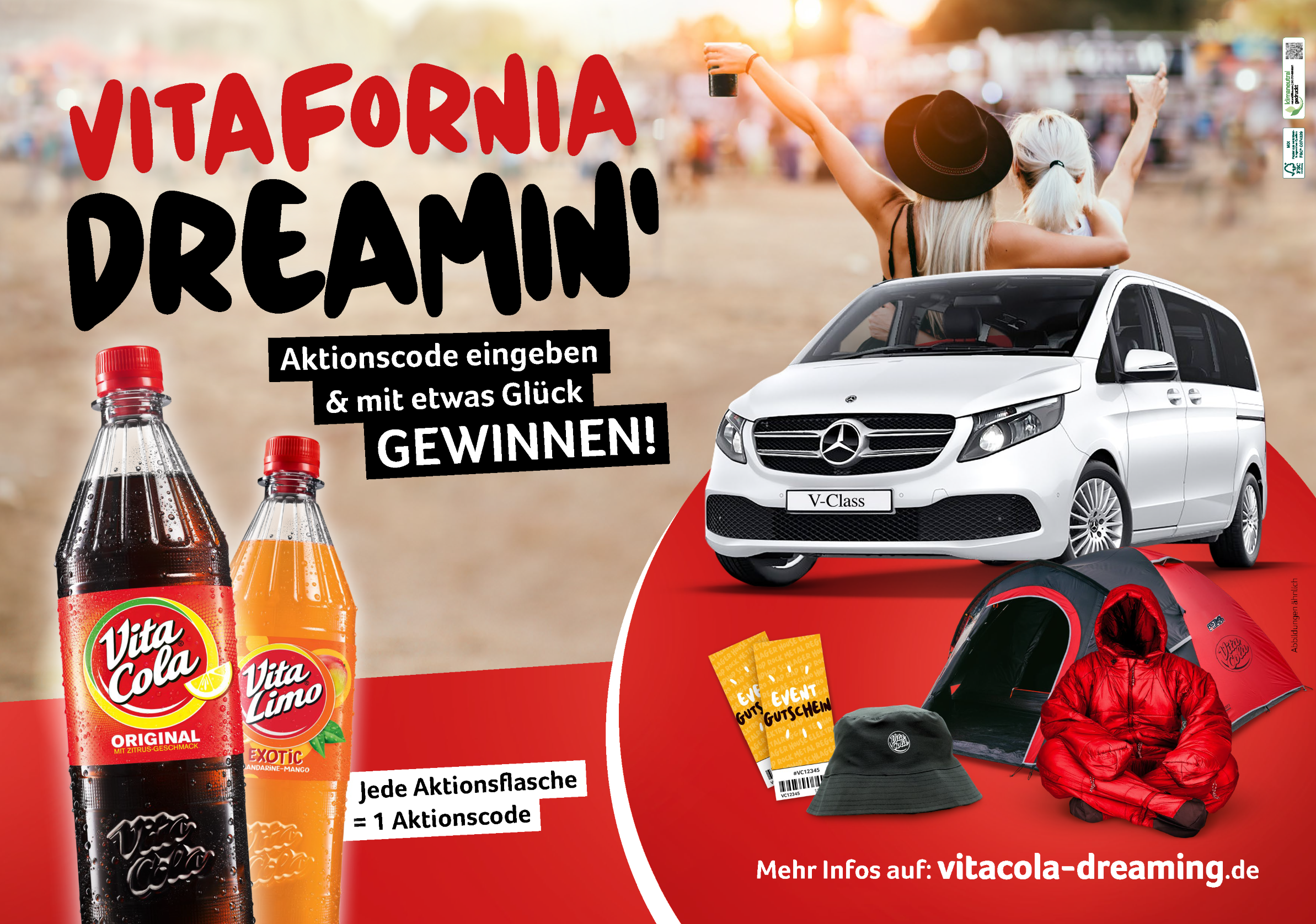 Jeder online unter www.vitacola-dreaming.de eingegebene Aktionscode eröffnet die Chance auf einen der attraktiven und festivaltauglichen Sofortgewinne. Darunter sind 4-Personen-Zelte, Hygger Schlafsäcke und sogenannte Anglerhüte, aber auch eventim-Gutscheine im Wert von jeweils 150 €, die man z.B. für Festivalkarten einlösen kann. Am Ende wird unter allen Teilnehmern der Hauptpreis verlost - eine Mercedes Benz V-Klasse im Wert von über 62.000 Euro bringt dem Hauptgewinner maximale Freiheit und Unabhängigkeit, sei es auf einem Festival oder bei Outdoortrips.